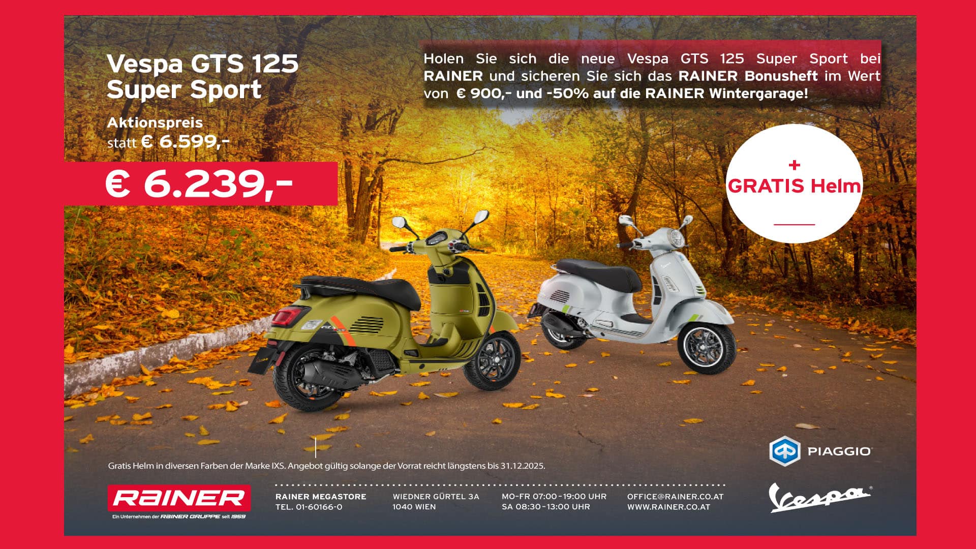 Hol Dir deine neue Vespa GTS 125 Super Sport bei RAINER uns sichere dir das RAINER Bonusheft im Wert von € 900,- und -50% auf die RAINER Wintergarage!
