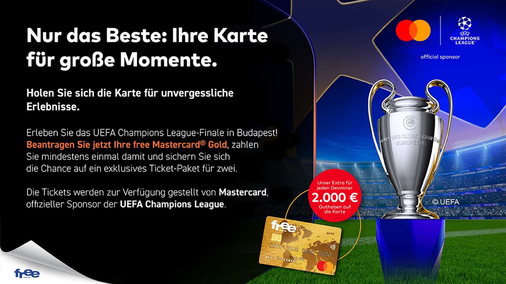 Mit der free Mastercard® Gold kann dieser Traum jetzt wahr werden: Wenn sie ihre Karte beantragt und mindestens einmal nutzt, hat sie die Chance auf ein exklusives Ticket-Paket für zwei Personen zum großen Finale in Budapest – inklusive Flug, Hotel und Transfers!